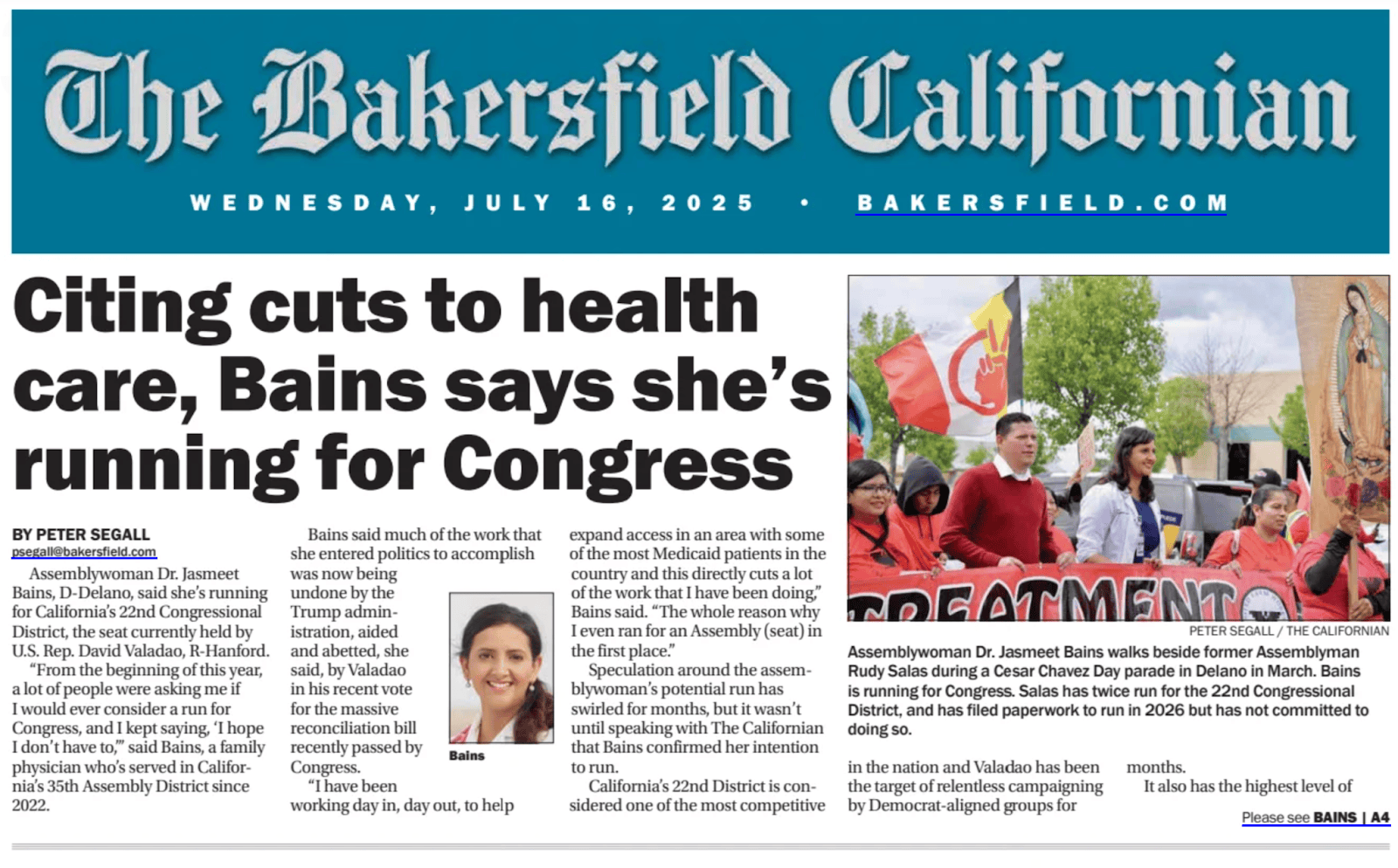 DELANO, CA - Last week, Dr. Jasmeet Bains, a family physician and Assemblywoman from Delano, officially launched her campaign for California’s 22nd Congressional District — and the news has traveled fast. Voters across the Valley are learning more about the doctor taking on Rep. David Valadao after his vote to gut Medi-Cal and slash affordable health care access for working families.
